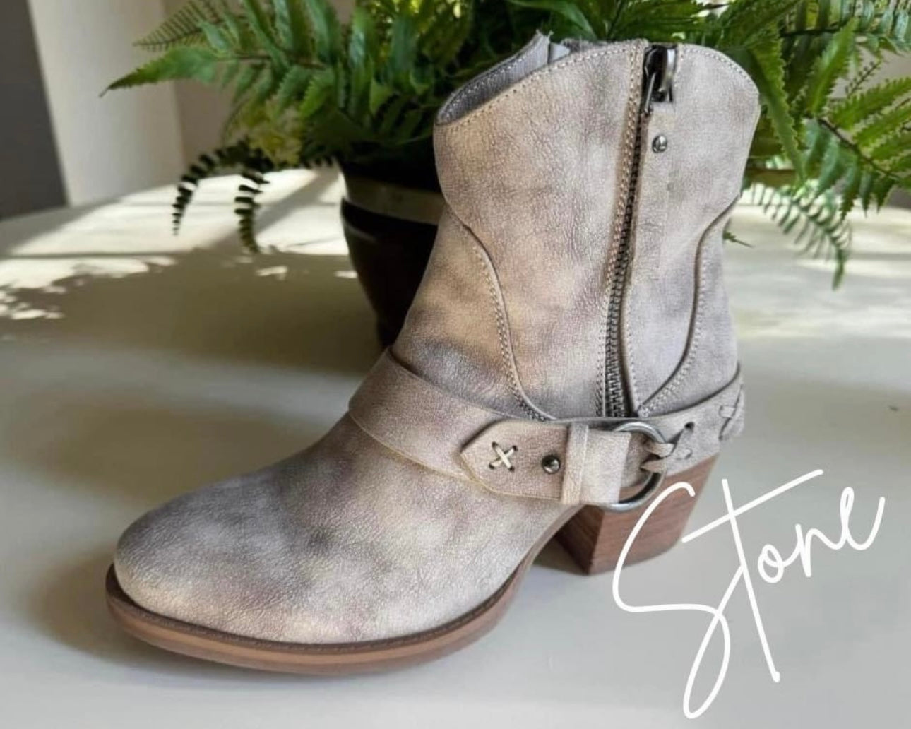 The Kick it Up Boots are the perfect boots for your next concert in this stone color!! They have a buckle and faux zipper on the outside of the boot. There is a zipper on the inner side of the ankle for easy on and off. These are SO CUTE! These fit true to size.